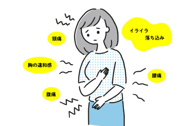 更年期では、ホットフラッシュ、不眠、動悸、イライラ、関節痛、記憶力の低下、体型変化…。
