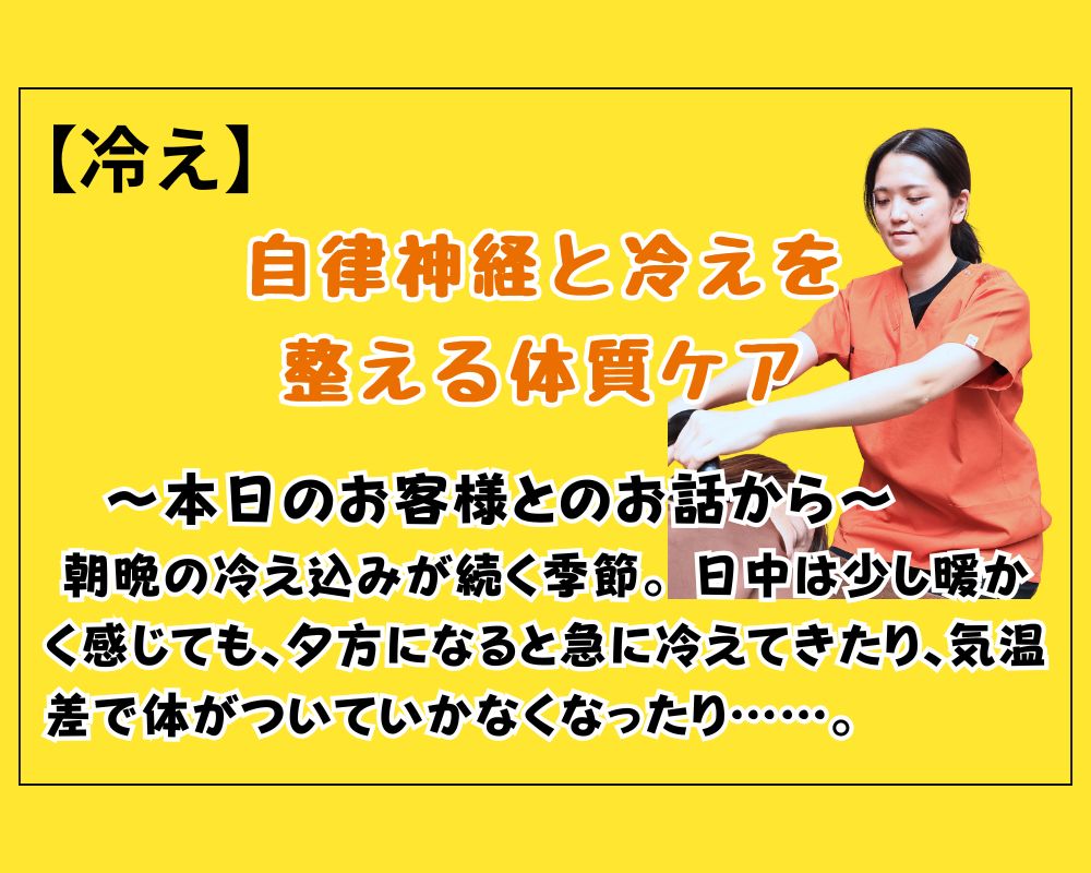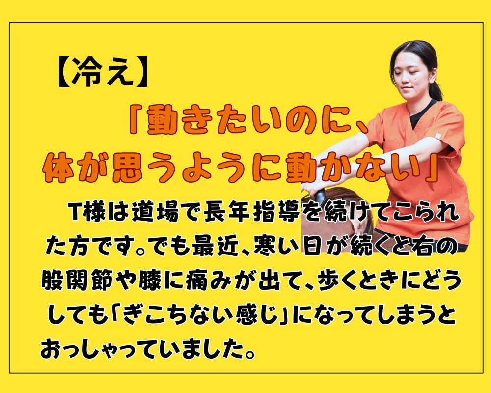 施術の中でお話を伺うと、冷えによって筋肉が縮み、血の巡りが悪くなっていることが見えてきました。
