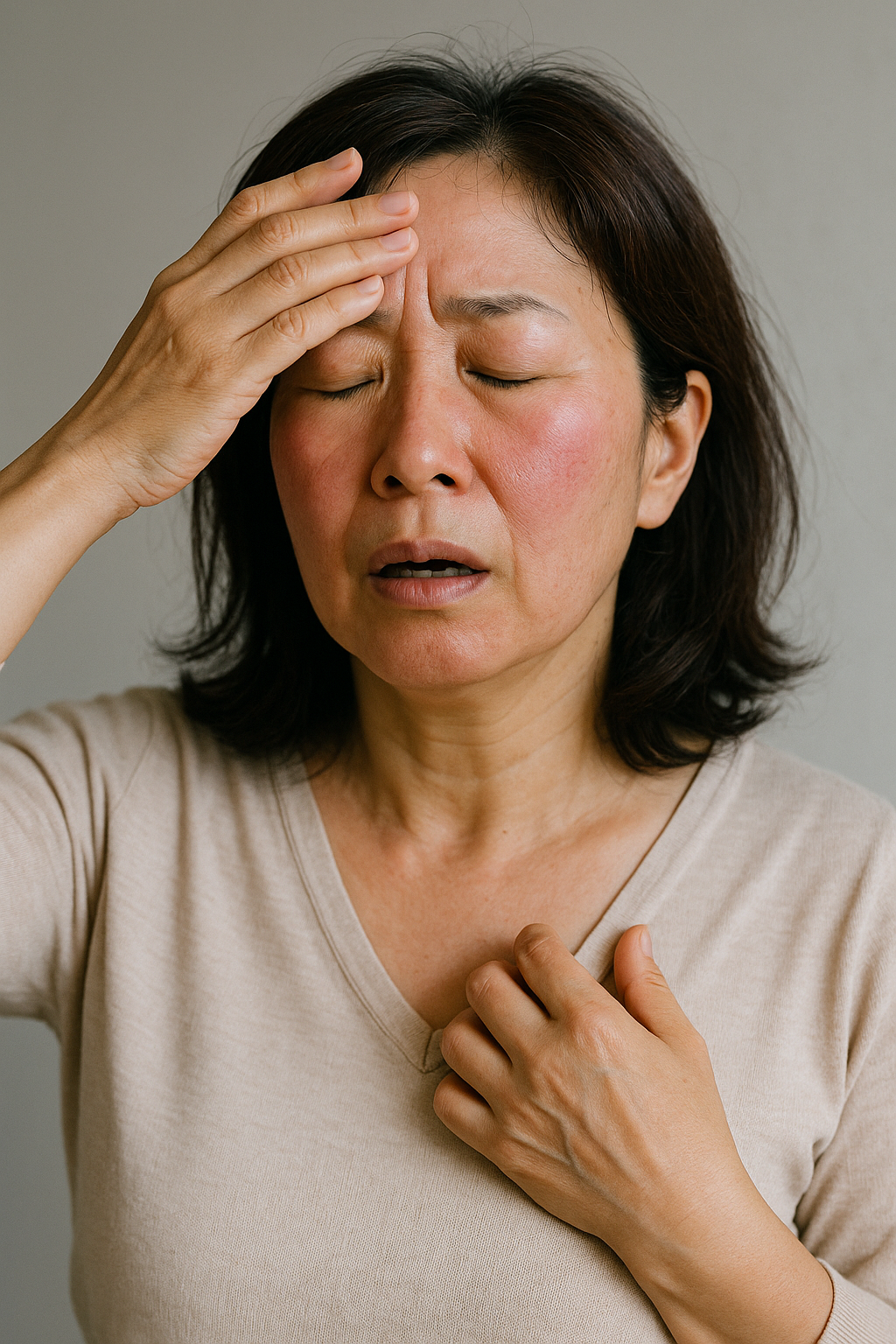 その結果、体は急いで熱を放出しようと、皮膚の表面にある血管を急激に拡張させ、大量の汗をかきます。これが、突然顔や首、胸元がカーッと熱くなり、汗がどっと噴き出すというホットフラッシュの症状として現れるのです。また、動悸やめまいを伴うこともあります。